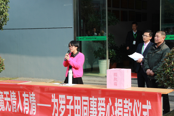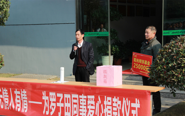 鄭總致辭道:“樂善好施、扶貧幫困是我們晶科人的傳統(tǒng)美德;相互幫助、患難扶持是我們企業(yè)倡導的文化新風。它既體現(xiàn)了晶科人高尚的品質、美好的情感和道德情操,又是企業(yè)文明與進步的標志。病魔無情人有情,身為晶科光伏大家庭的一員,羅子田就是我們的家人,有困難大家一起解決!”鄭總的話讓羅子田家屬看到希望的曙光,更讓在場的員工們感到陣陣溫暖。